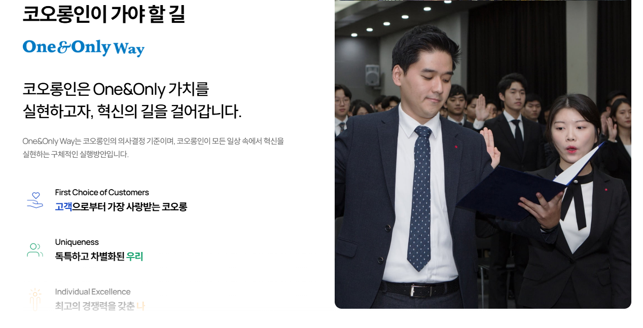 코오롱그룹은 ONE&ONLY라는 키워드 아래, 지원자의 차별화된 경쟁력을 중요하게 평가합니다.