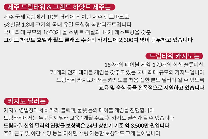 제주도의 랜드마크, 제주 드림타워 복합리조트에서 카지노 및 호텔 부문 대규모 공채를 시작했습니다! 호텔리어나 카지노 딜러를 꿈꾸던 많은 분들에게는 정말 설레는 소식이 아닐 수 없는데요.
