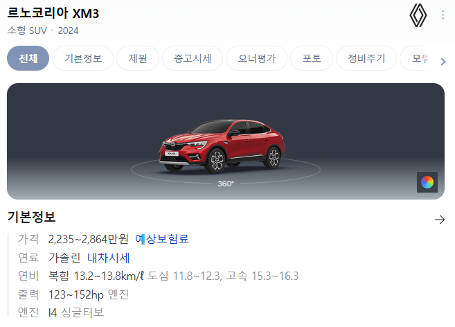 르노코리아 XM3는 스포티한 디자인과 우수한 연비로 주목받는 소형 SUV입니다. 유럽차 같은 느낌의 디자인과 경제적인 연비로 도심 주행에 적합합니다. 특히 트렁크 공간이 넓어 실용성이 높습니다.