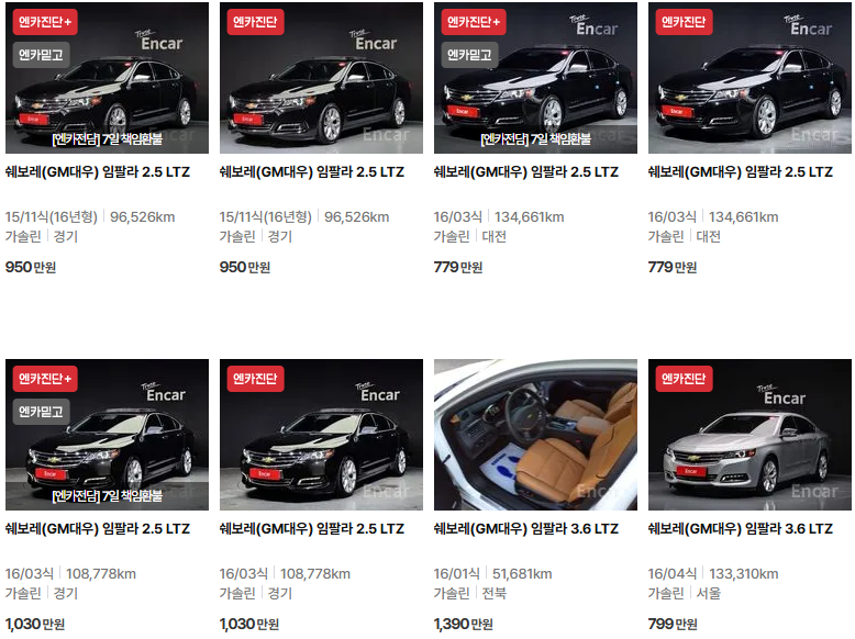 특징: 임팔라는 쉐보레의 대형 세단으로, 넓은 실내 공간과 안정적인 주행 성능을 제공합니다. 그러나 국내 시장에서의 판매 부진으로 인해 중고차 감가율이 높습니다.