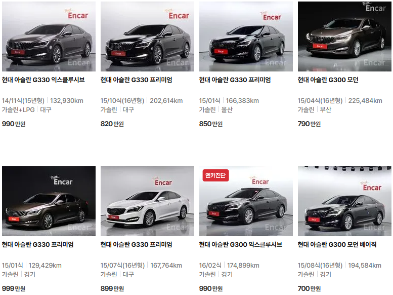 특징: 아슬란은 현대자동차의 프리미엄 세단으로 출시되었으나, 그랜저와 제네시스 사이에서 애매한 포지셔닝으로 인해 판매량이 저조했습니다. 이로 인해 중고차 시장에서 감가율이 높습니다.