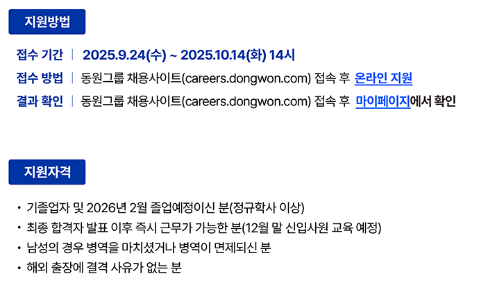 - 2025 하반기 동원그룹 채용은 10월 14일까지 진행되며, 팩트 기반 의사결정과 최종 결과물에 대한 책임감을 강조하는 인재를 선호합니다.