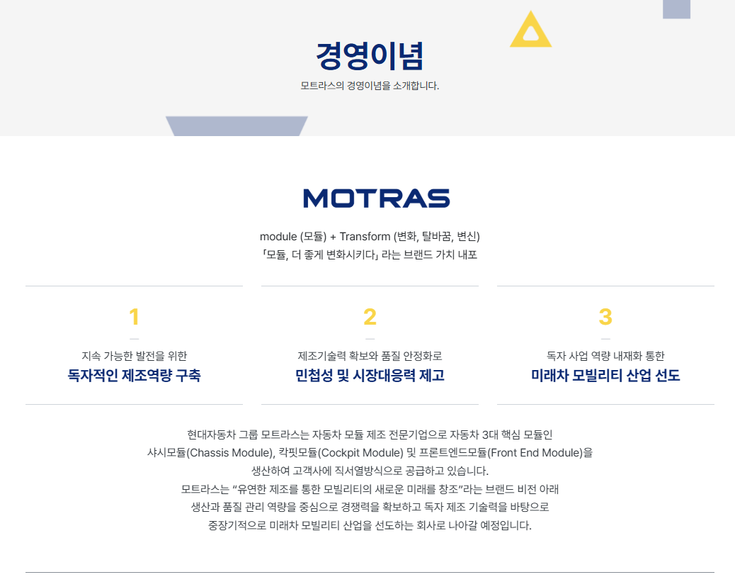 모트라스는 현대자동차그룹 계열사로 2022년 설립된 자동차 부품 전문 기업입니다. 자동차 3대 핵심모듈인 샤시모듈, 칵핏모듈, 프론트엔드모듈을 생산하여 완성차에 직서열 방식으로 공급하고 있습니다. 약 5,125명의 직원이 근무하는 대기업으로, 매출액은 7,321억 원에 달합니다. 특히 생산과 품질 관리 역량을 중심으로 경쟁력을 확보하고, 독자 기술력을 바탕으로 미래차 모빌리티 산업을 선도하는 기업입니다. 이러한 기업 특성을 자소서에 녹여내는 것이 중요합니다.
