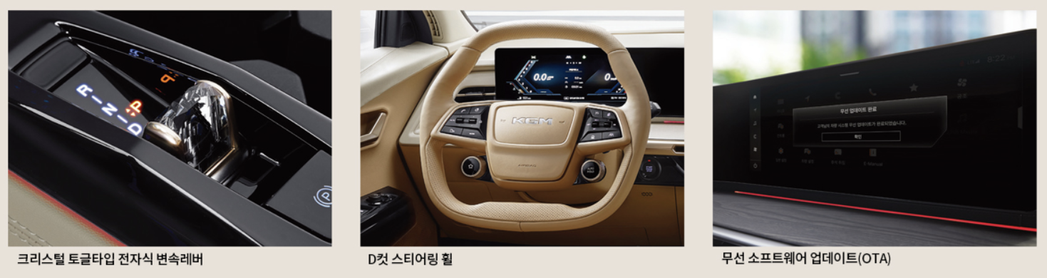 액티언의 실내는 중형 SUV 수준의 넓은 공간과 고급스러운 소재로 구성되어 있습니다. 12.3인치 클러스터와 12.3인치 인포콘 내비게이션이 일체형으로 연결된 파노라마 디스플레이는 주행에 필요한 정보를 직관적으로 제공합니다. 또한, 퀼팅 패턴 스웨이드 콤비 시트와 천연 가죽 시트, 크리스털 소재 토글 타입 전자식 변속레버 등은 실내 품격을 높여줍니다. 실내 조명은 다양한 색상으로 조절 가능하며, 고급스러운 분위기를 연출합니다. 또한, 2열 시트는 60:40 비율로 폴딩이 가능해 다양한 적재 공간을 제공합니다.