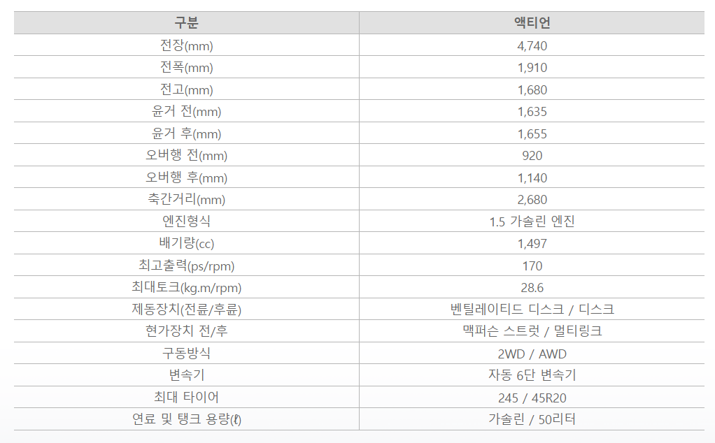 액티언은 1.5리터 터보차저 GDi 4기통 가솔린 엔진을 탑재해 168마력과 280Nm의 토크를 발휘합니다. 6단 자동 변속기와 전륜 또는 4륜 구동 옵션을 제공합니다. 차량의 길이는 4,740mm, 너비는 1,920mm, 높이는 1,680mm로, 휠베이스는 2,680mm입니다. 이러한 제원은 도심 주행뿐만 아니라 장거리 주행에서도 안정적인 성능을 제공합니다. 또한, 연비는 복합 12.5km/L로 경제성을 갖추고 있습니다.