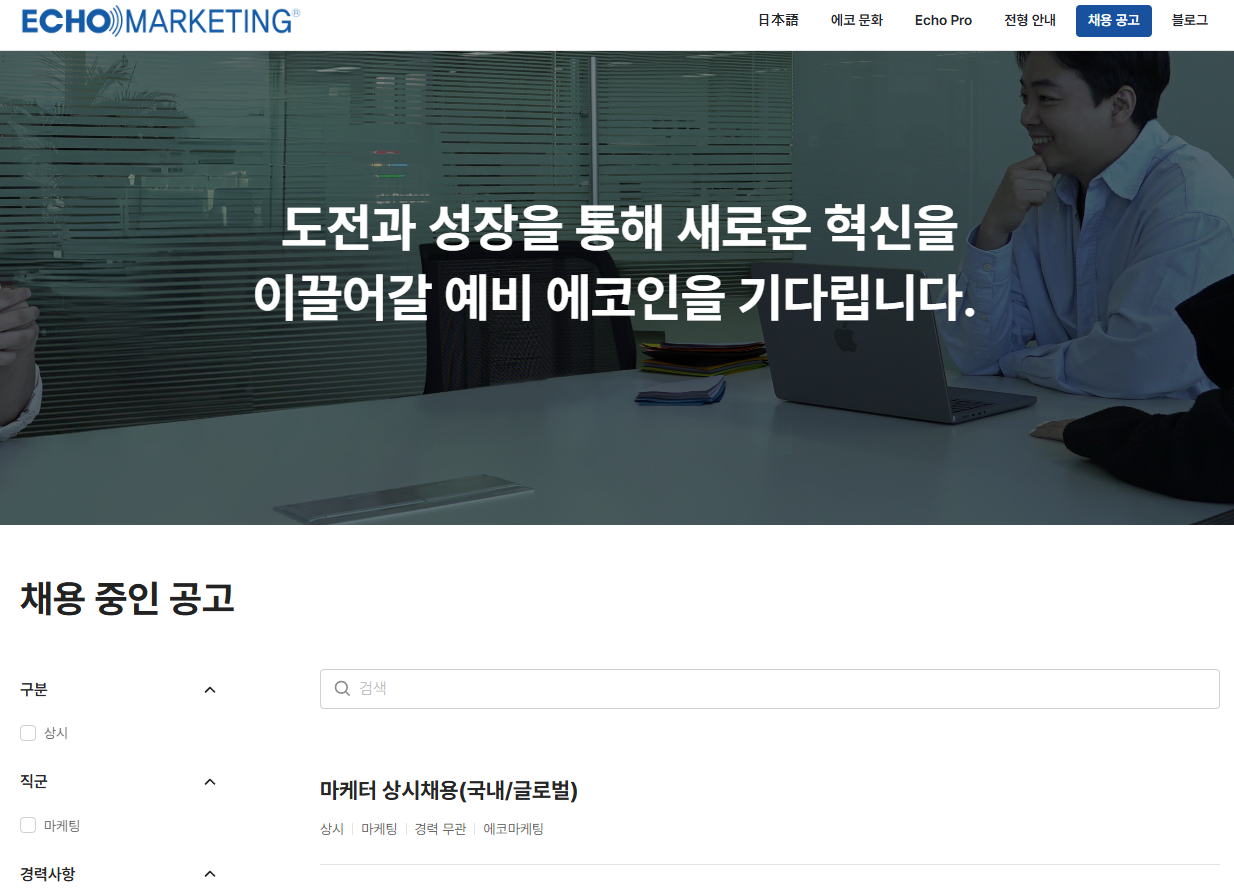 에코마케팅은 2025년에도 신입과 경력을 가리지 않고 인재를 상시 채용하고 있습니다. 특히 '퍼포먼스 마케팅 (교육) 인턴/신입사원' 채용 공고가 자주 올라오며, 이는 실무형 인재를 직접 육성하려는 회사의 의지를 엿볼 수 있는 부분입니다. 이 외에도 글로벌(일본) 마케터, 광고 디자이너, IT 운영 관리자, 재무 등 다양한 직군에서 채용을 진행합니다.