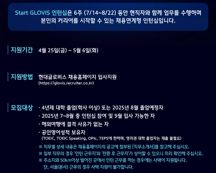 먼저 현대글로비스의 2025년 상반기 Start GLOVIS 인턴십 채용 정보부터 살펴보겠습니다.