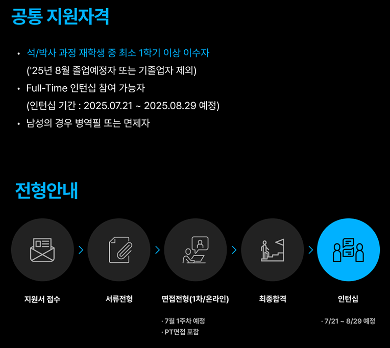 지원자격은 석/박사 과정 재학생(2025년 8월 졸업예정자 및 기졸업자 제외), Full-Time 인턴십 참여 가능자, 남성의 경우 병역필 또는 면제자입니다.