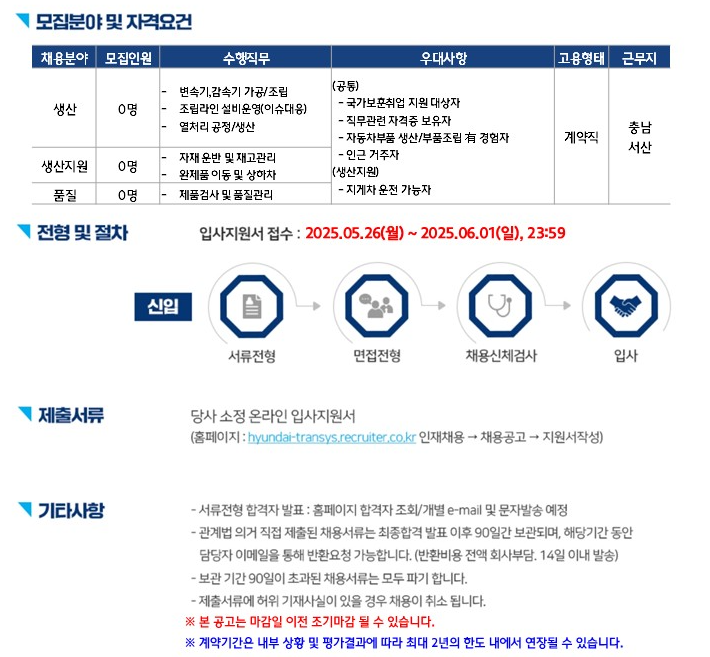 2025년 현대트랜시스 생산직 채용은 지속적으로 진행되고 있으며, 특히 안전의식과 품질관리 역량을 중요하게 평가합니다. 채용 과정은 서류전형, 면접전형, 건강검진 순으로 진행됩니다.