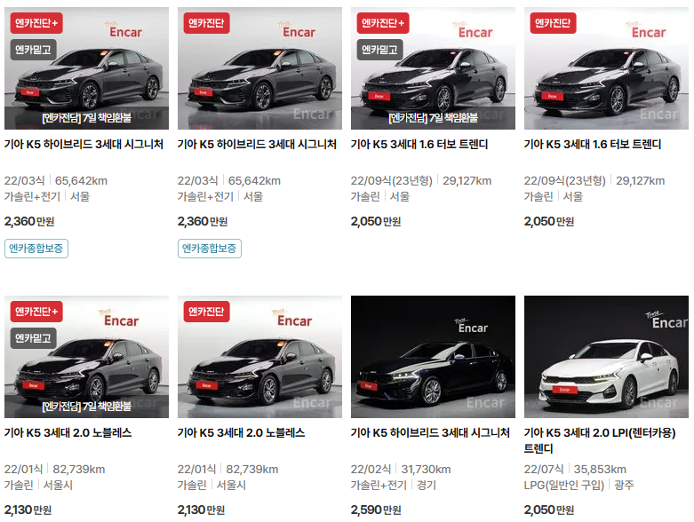 K5는 세련된 디자인과 다양한 파워트레인 옵션으로 소비자 선택의 폭이 넓습니다. 2022년식 모델은 신차 대비 30% 이상 저렴한 가격에 구매 가능하며, 첨단 주행 보조 시스템을 갖추고 있어 안전성도 우수합니다.