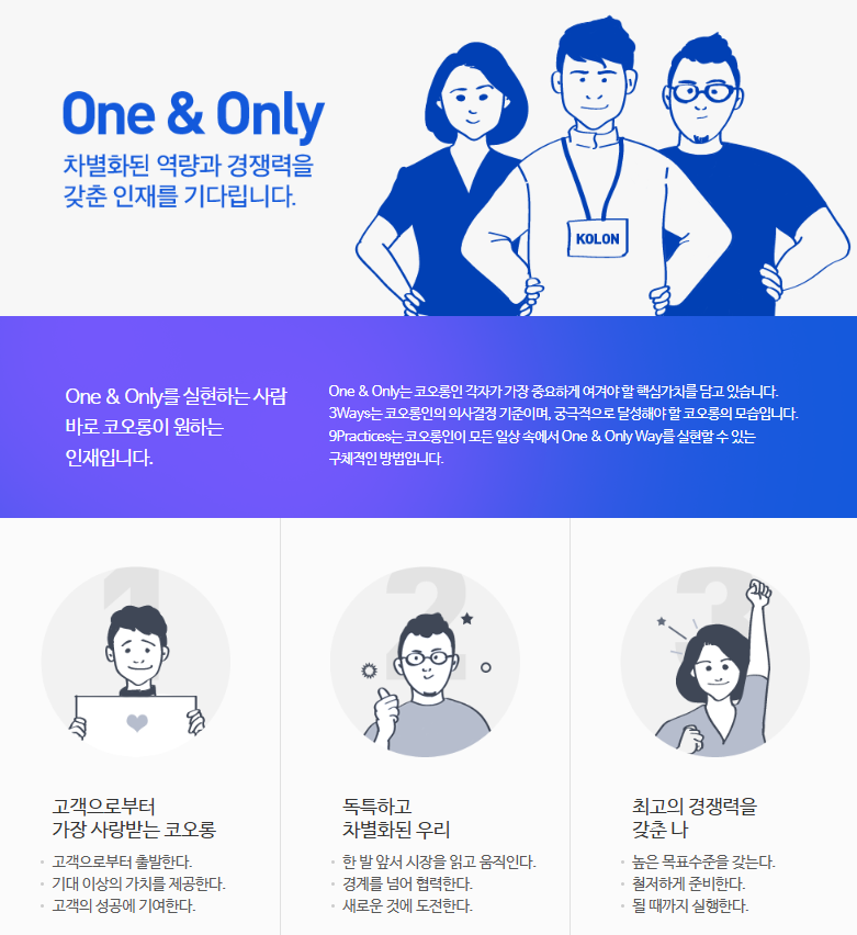 코오롱그룹은 ONE&ONLY라는 키워드 아래, 지원자의 차별화된 경쟁력을 중요하게 평가합니다.