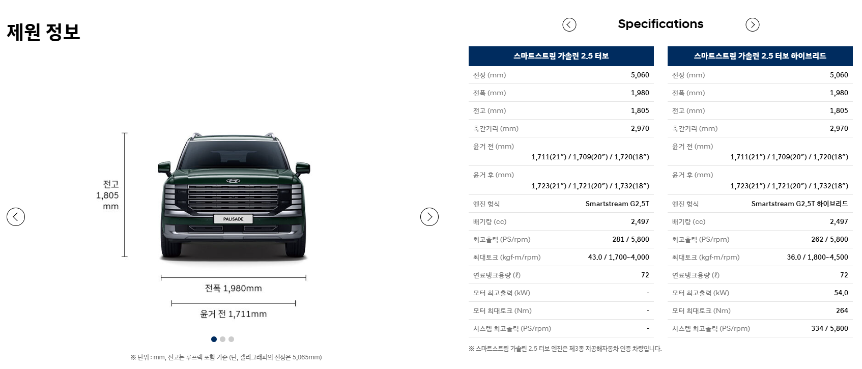 2025년형 팰리세이드는 기존의 3.8L V6 엔진 대신, 2.5L 가솔린 터보 엔진과 2.5L 가솔린 터보 하이브리드 엔진을 새롭게 도입했습니다. 디젤 모델은 환경 규제를 고려해 단종되었으며, 하이브리드 모델의 추가로 연비 효율이 더욱 개선되었습니다.
