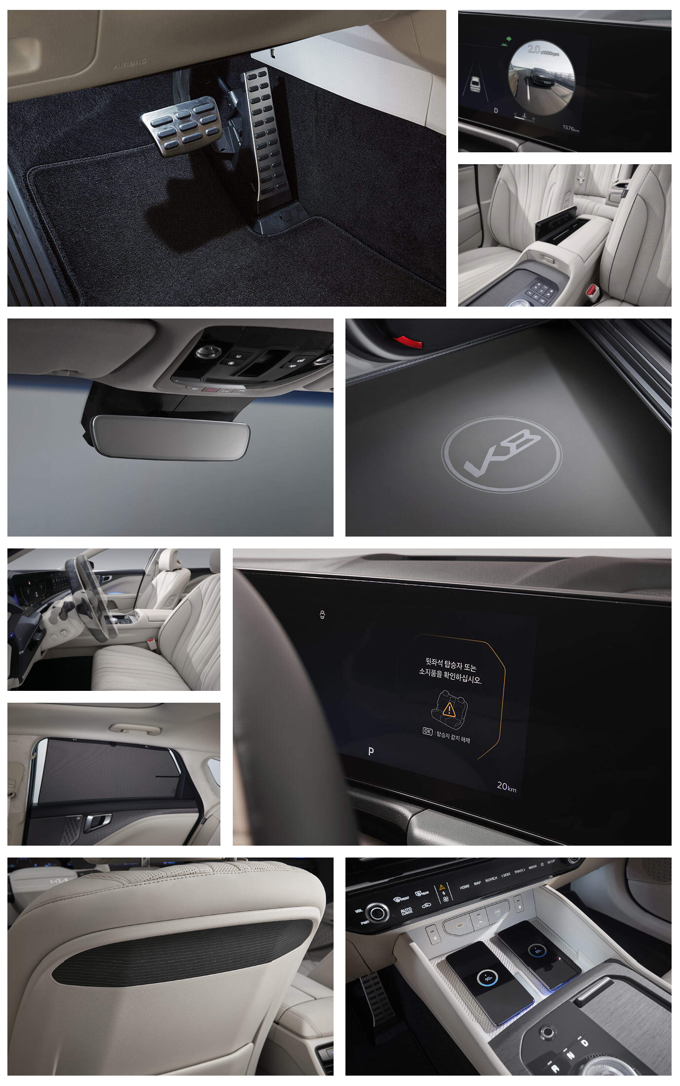 K8 페이스리프트 모델의 인테리어는 고급스러움과 편안함을 동시에 제공합니다. 새로운 디자인의 대시보드와 센터 콘솔은 운전자의 편의성을 극대화하였으며, 고급 소재를 사용하여 더욱 럭셔리한 분위기를 연출합니다. 또한, 최신 인포테인먼트 시스템과 12.3인치 디지털 계기판이 탑재되어, 운전 중에도 다양한 정보를 손쉽게 확인할 수 있습니다. 특히, 넓은 실내 공간과 편안한 시트는 장거리 운전 시에도 피로감을 최소화해줍니다.